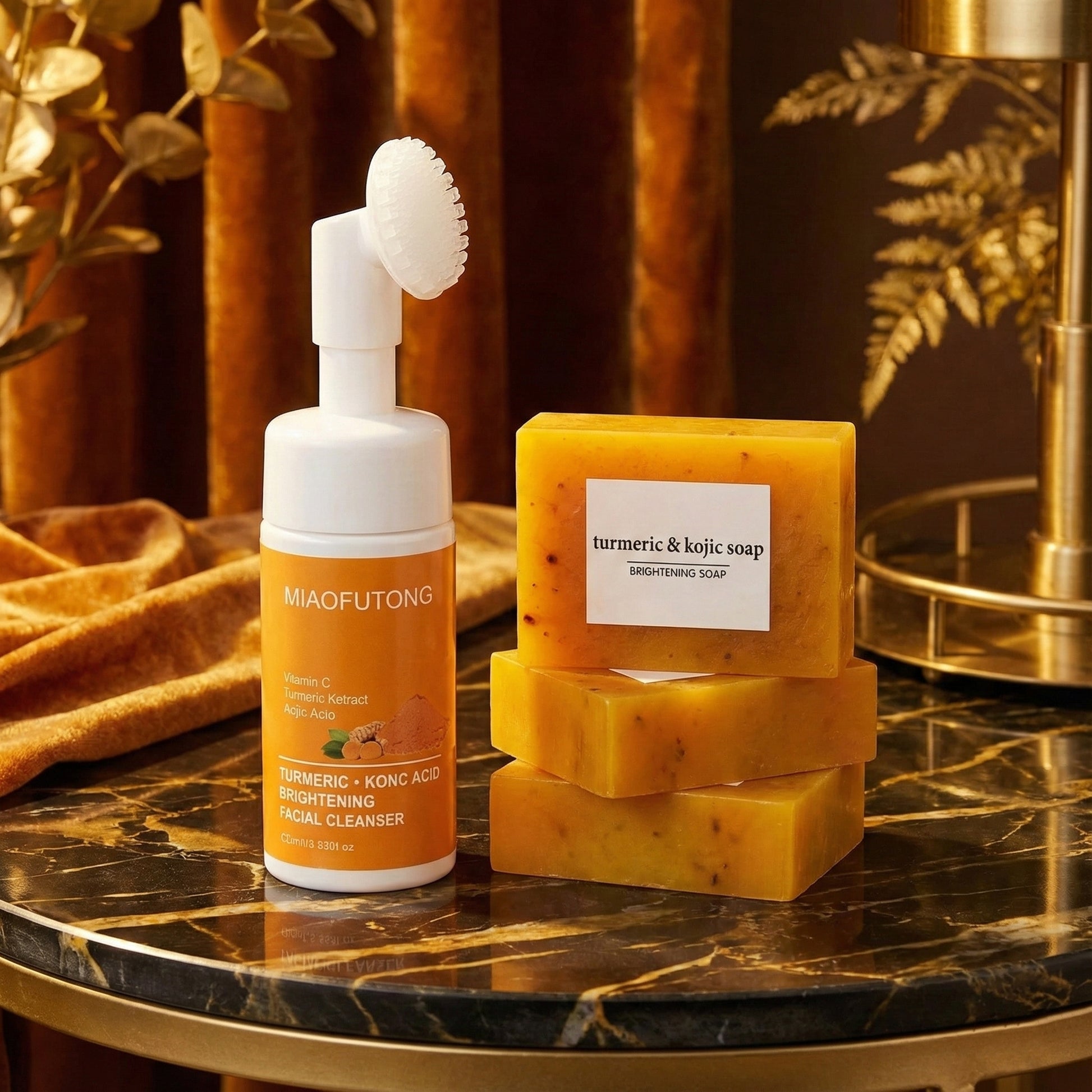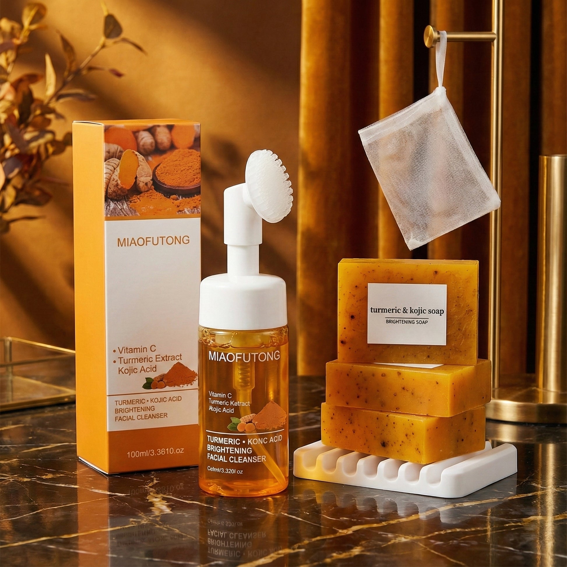Este set de limpieza facial a base de cúrcuma incluye una mousse limpiadora y un jabón sólido, diseñados para proporcionar una limpieza suave pero efectiva dentro de tu rutina de cuidado de la piel. Su fórmula combina extracto de cúrcuma, agua de cúrcuma, ácido kójico, extracto de limón, vitamina B5 y vitamina A, logrando una acción purificante que ayuda a mantener el rostro hidratado, uniforme y luminoso. Apto para todos los tipos de piel y libre de alcohol, este dúo ofrece un cuidado diario seguro y equilibrado para quienes buscan un limpiador suave pero eficaz.
